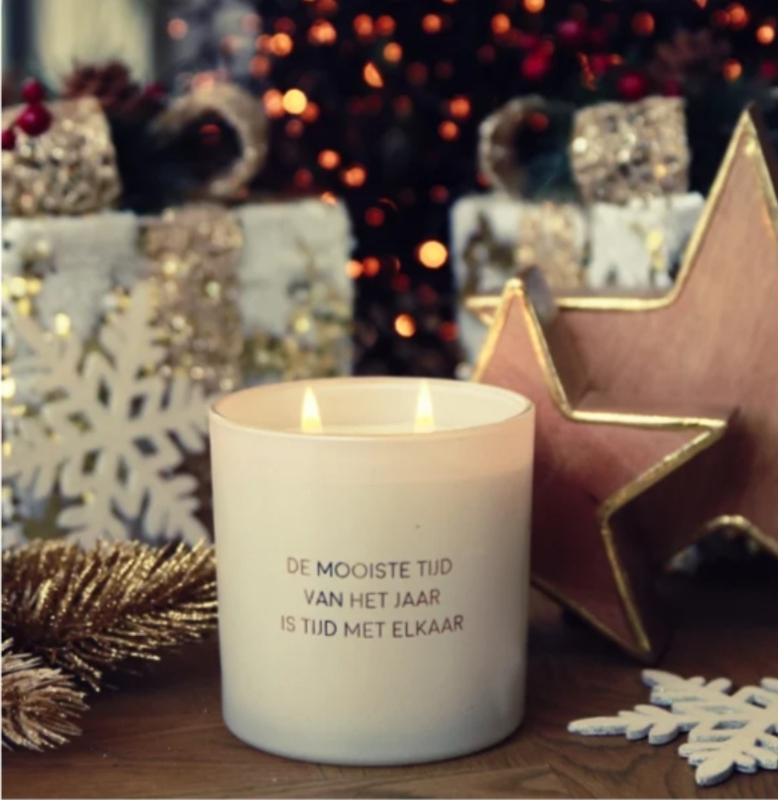 Op de geurkaars staat 'De mooiste tijd van het jaar is tijd met elkaar'.
