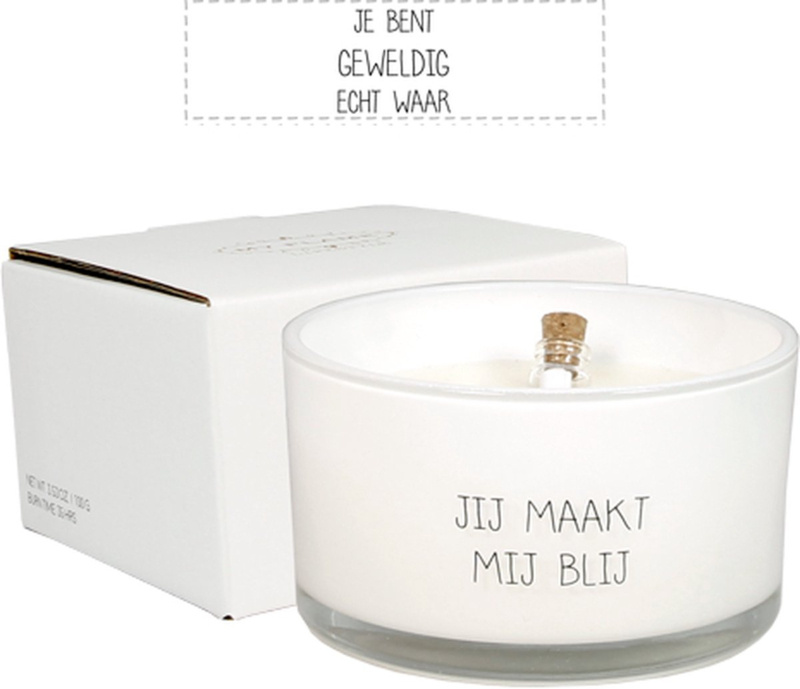 Op de geurkaars staat 'Jij maakt mij blij'. In de wax vind je een flesje met daarin een briefje. Voordat je de kaars brandt kan je het flesje uit de wax trekken, de kurk van het flesje en het briefje eruit halen. Op het briefje staat 'Jij bent geweldig, echt waar'. Een mooi cadeau met een leuk complimentje!