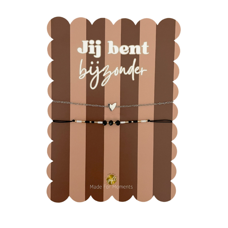 De set komt op een luxe kaart met de tekst 'Jij bent bijzonder' en op de achterkant is ruimte om een persoonlijke boodschap te schrijven. Zo wordt het sieraad ook een kaart en een blijvende herinnering.