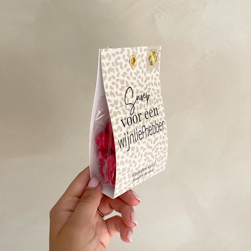 Deze vrolijke verpakking bevat heerlijke wijnballen – zonder alcohol-, maar mét een flinke knipoog.