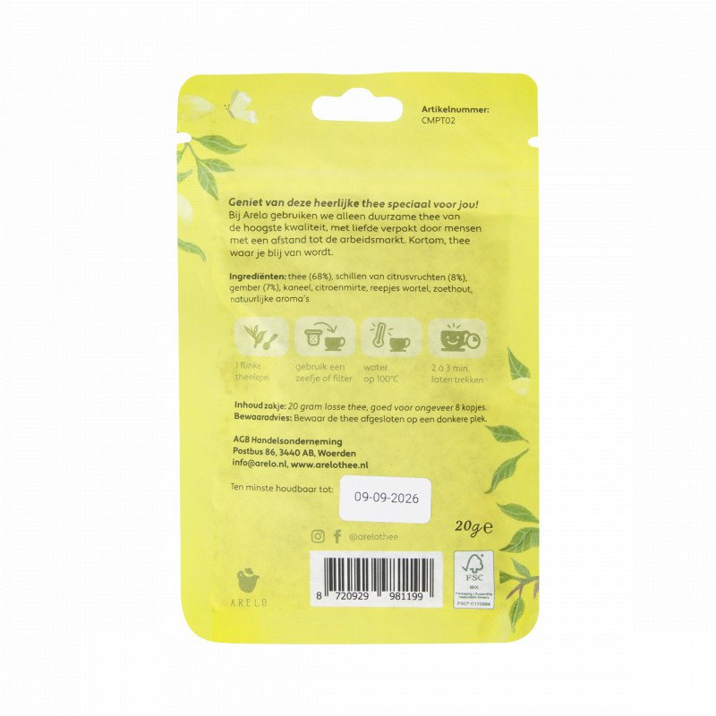 20 gram losse thee van hoge kwaliteit ingepakt door mensen met een afstand tot de arbeidsmarkt.