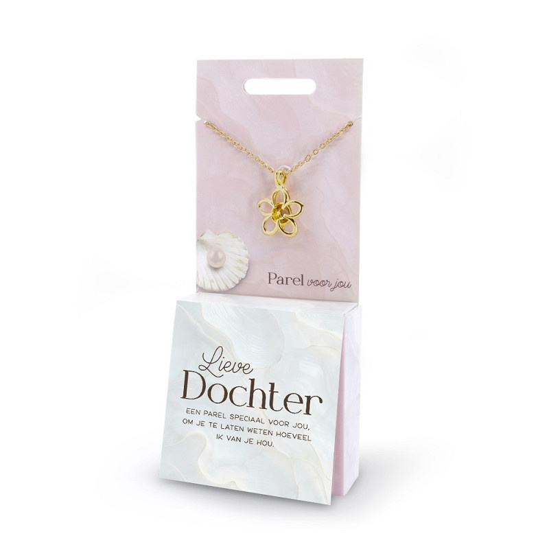 Artikelnummer: A842f OverzichtDeze bijzondere collectie combineert de magie van een echte parel met stijlvolle halskettingen in een luxe verpakking. Hanger in de vorm van een bloem.