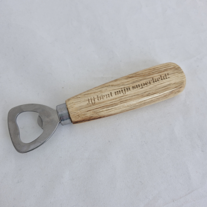 De tekst werd in de houten flesopener gegraveerd. U heeft de keuze uitverschillende teksten.