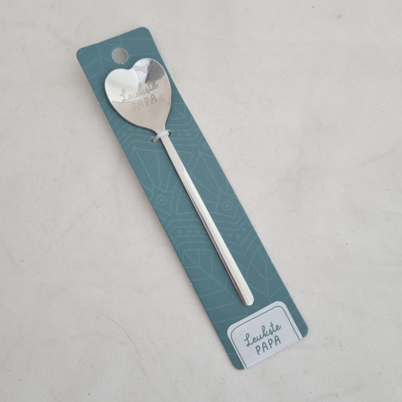 De tekst 'Leukste papa' werd erin gelaserd. Lepel in de vorm van een hartje.